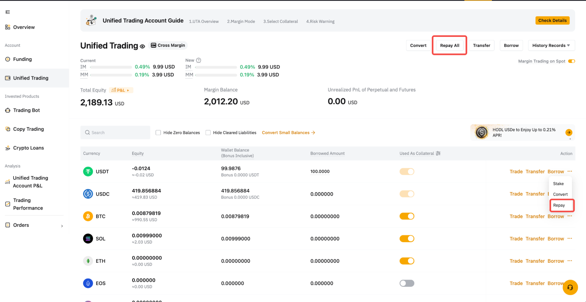 Để hoàn trả khoản vay từ Giao Dịch Ký Quỹ Giao Ngay, hãy nhấp vào Hoàn Trả bên cạnh tài sản bạn đã vay hoặc chọn Hoàn Trả Tất Cả để hoàn trả toàn bộ các tài sản đã vay. Để biết thêm chi tiết, vui lòng tham khảo Cách Hoàn Trả Thủ Công Trong Tài Khoản Giao Dịch Của Bạn.
