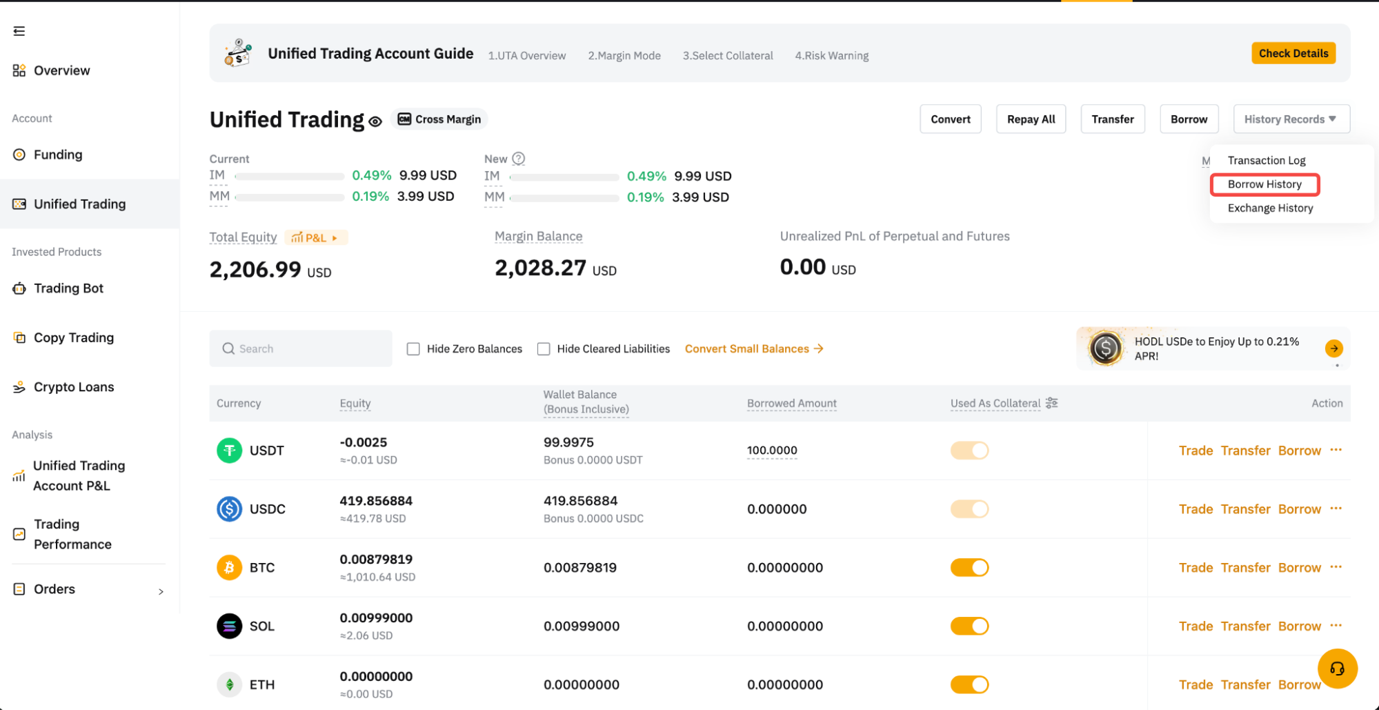 Bước 3: Sau khi vay, bạn có thể xem số lượng đã vay của từng coin trong Tài Khoản Giao Dịch. Để xem tổng quan tất cả các khoản vay của bạn, hãy vào Lịch Sử Vay.