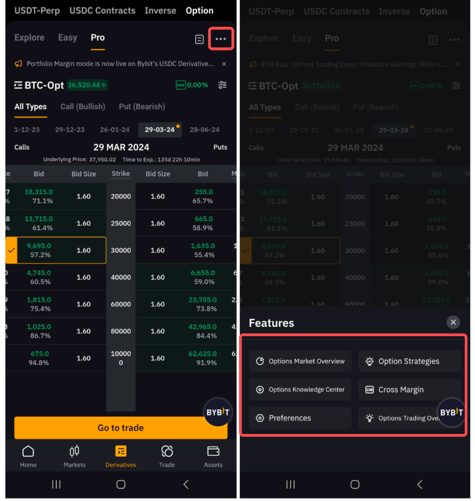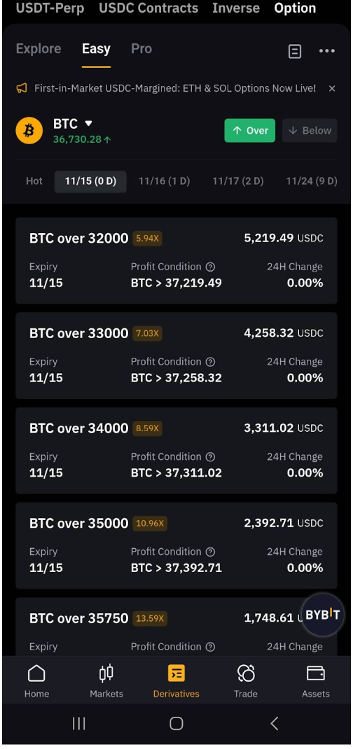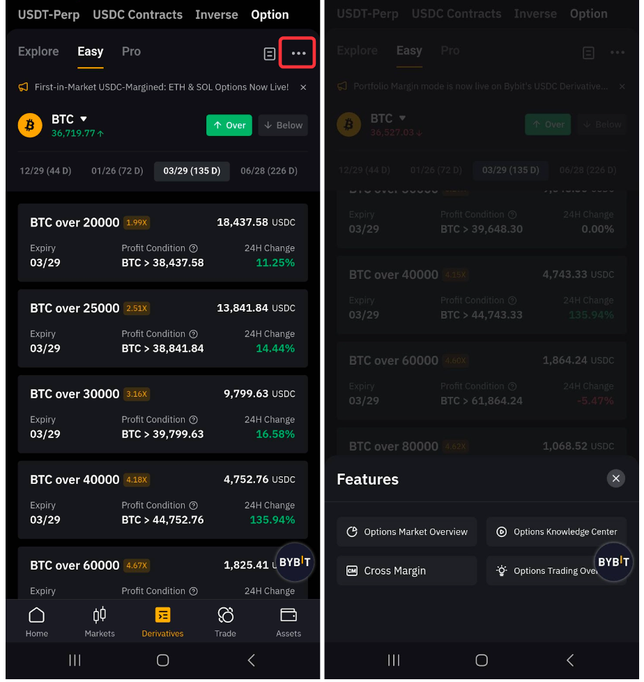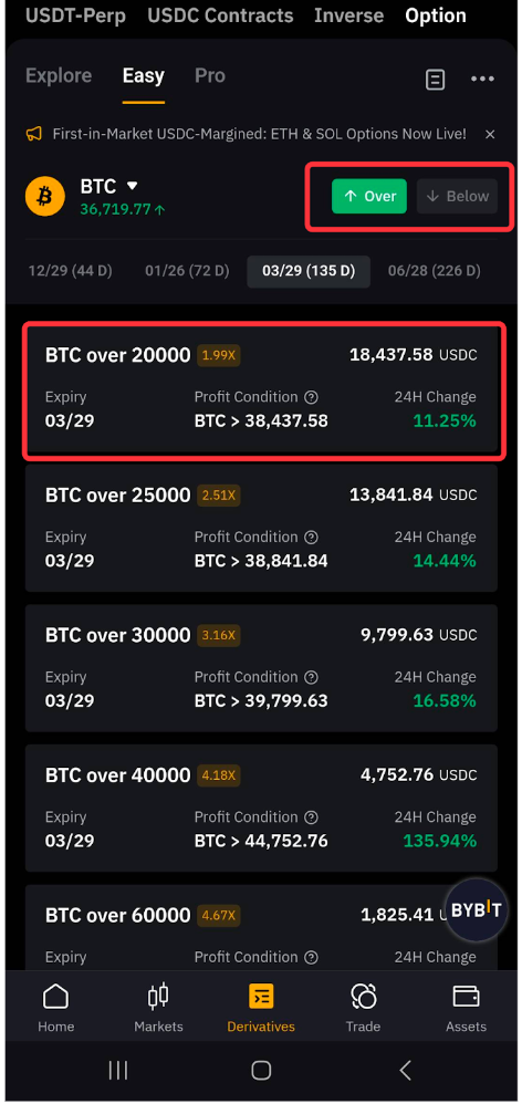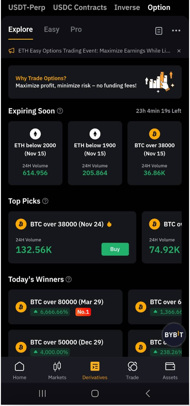 Để truy cập Bybit Quyền Chọn Easy, trước tiên hãy khởi chạy Bybit App Từ trang chủ, chọn Phái Sinh và nhấn vào Quyền Chọn. Thao tác này sẽ đưa bạn đến trang Bybit Options để chọn một trong ba chế độ, tùy thuộc vào trải nghiệm của bạn với giao dịch quyền chọn.