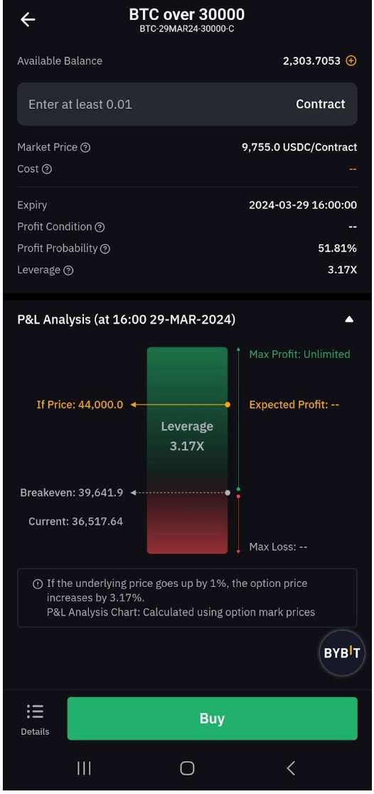 Để mua quyền chọn ở chế độ Easy, hãy nhấn vào thẻ hợp đồng để vào trang Mua. Trên trang Mua, nhập số tiền cần đầu tư để xem chi phí lệnh, ngày đáo hạn, điều kiện lợi nhuận, xác suất lợi nhuận, đòn bẩy và phân tích P&L.