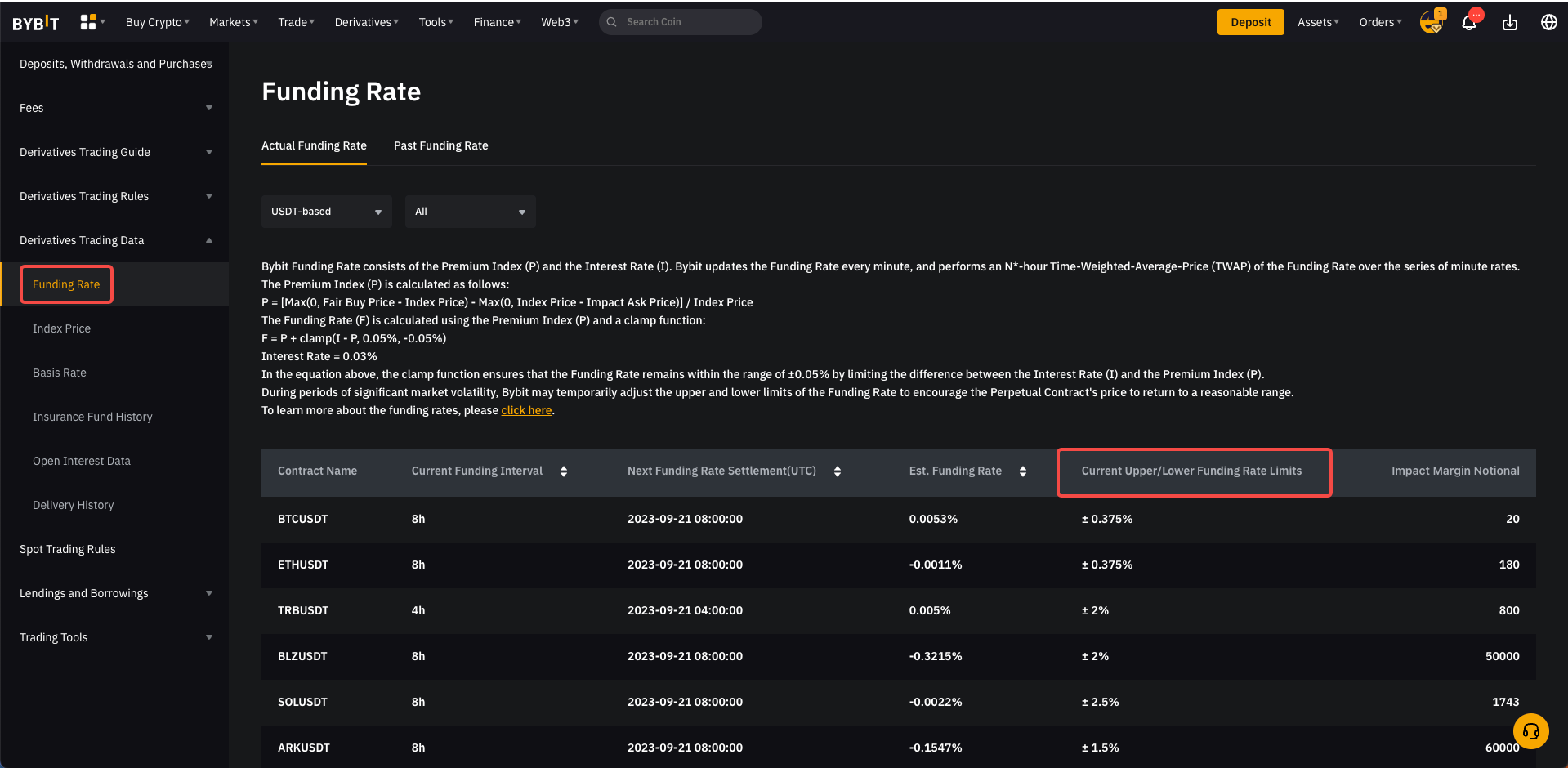 Trong trường hợp bình thường, giới hạn tỷ lệ funding = ± Min ((IMR-MMR) x 0,75, MMR), trong đó IMR và MMR thể hiện tỷ lệ ký quỹ ban đầu và yêu cầu tỷ lệ ký quỹ duy trì của bậc giới hạn rủi ro thấp nhất cho mỗi biểu tượng. Tuy nhiên, khi có chênh lệch giá đáng kể giữa thị trường hợp đồng tương lai và thị trường giao ngay, chúng tôi sẽ điều chỉnh hệ số 0,75, trong phạm vi từ 0,75 đến 1.