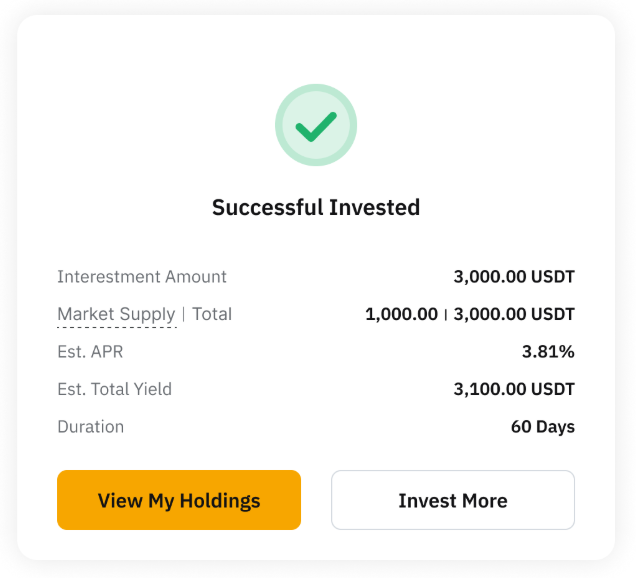 Bước 3: Nhập số tiền bạn muốn đầu tư và xem lại chi tiết lệnh, bao gồm APR, lợi nhuận dự kiến và thời gian thực hiện.