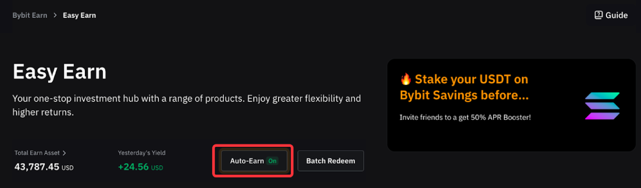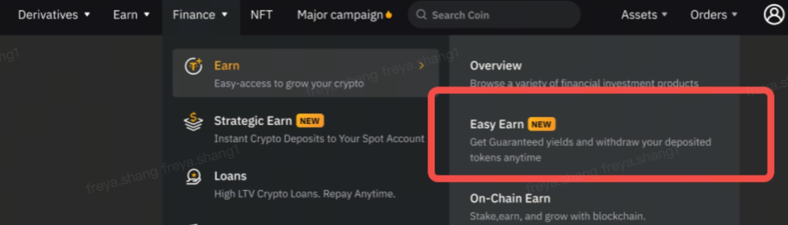 Bước 1: Đăng nhập vào tài khoản Bybit của bạn và nhấp vào Tài Chính → Sinh Lời → Sinh Lời Dễ Dàng trên thanh điều hướng.