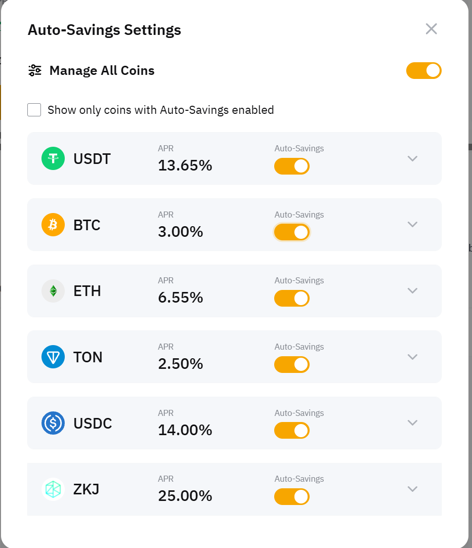 Bước 3: Nhấp vào Xác Nhận. Trang Cài Đặt Tự Động Sinh Lời sẽ hiển thị. Quản Lý Tất Cả Coin được bật theo mặc định. Tại đây, bạn có thể bật hoặc tắt Tự Động Sinh Lời cho từng coin được hỗ trợ.