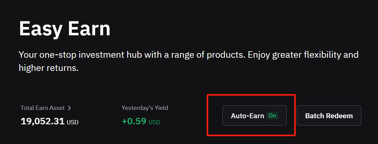 Tự Động Sinh Lời là tính năng cho phép bạn tự động đầu tư các tài sản nhàn rỗi từ Tài Khoản Vốn vào các sản phẩm Sinh Lời Dễ Dàng Kỳ Hạn Linh Hoạt. Khi được bật, tài sản nhàn rỗi của những đồng coin bạn đã chọn sẽ được tự động đầu tư vào lúc 17:00 sáng (giờ Việt Nam) mỗi ngày.