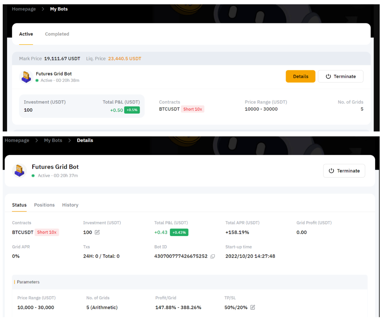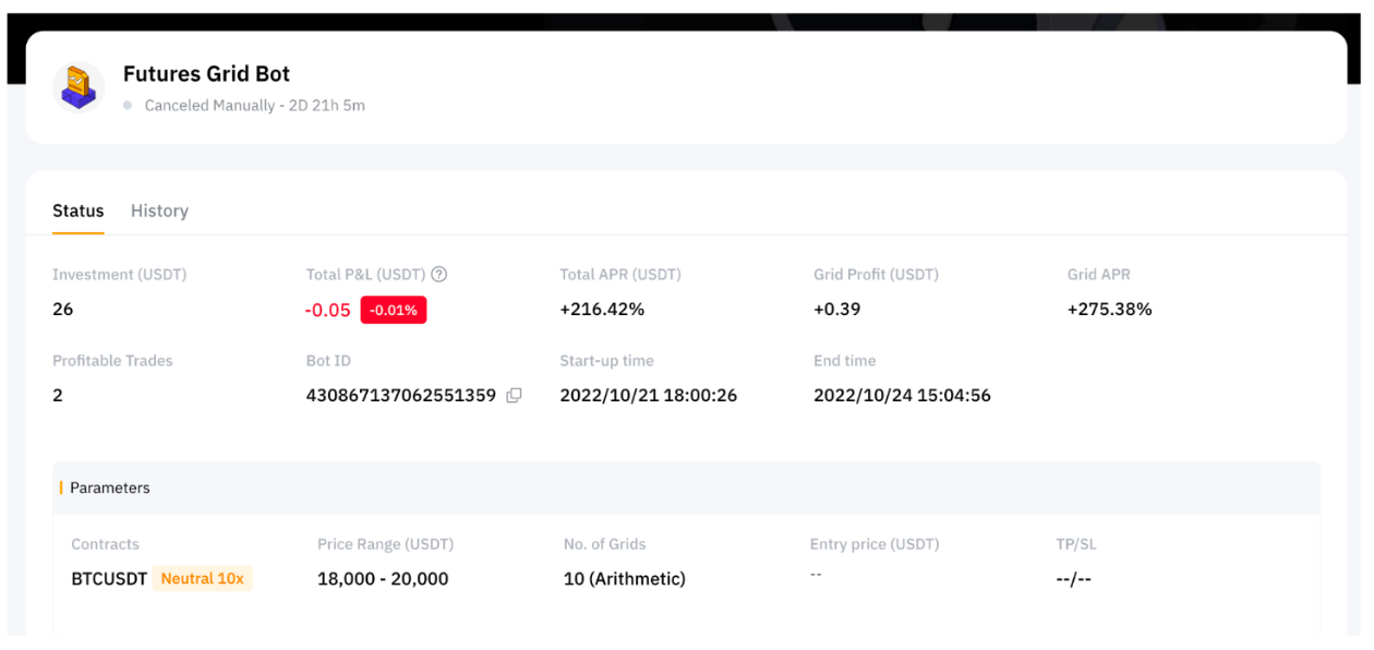 请前往我的机器人查看所有进行中和已完成的交易。您还可以点击详情查看您的交易详情,包括收益、总年化收益率以及价格区间。