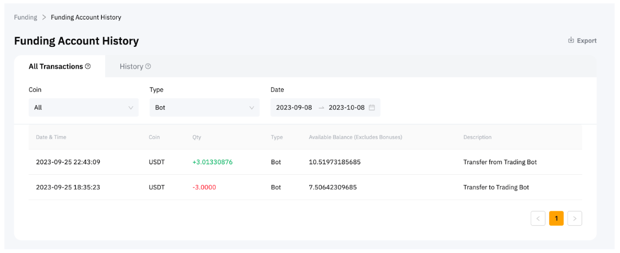 所有交易机器人将直接通过资金账户进行交易。当您创立合约网格机器人时,系统会自动将投资金额从您的资金账户转移到网格机器人。机器人停止后,投资金额和利润(如果有)也将转回您的资金账户。