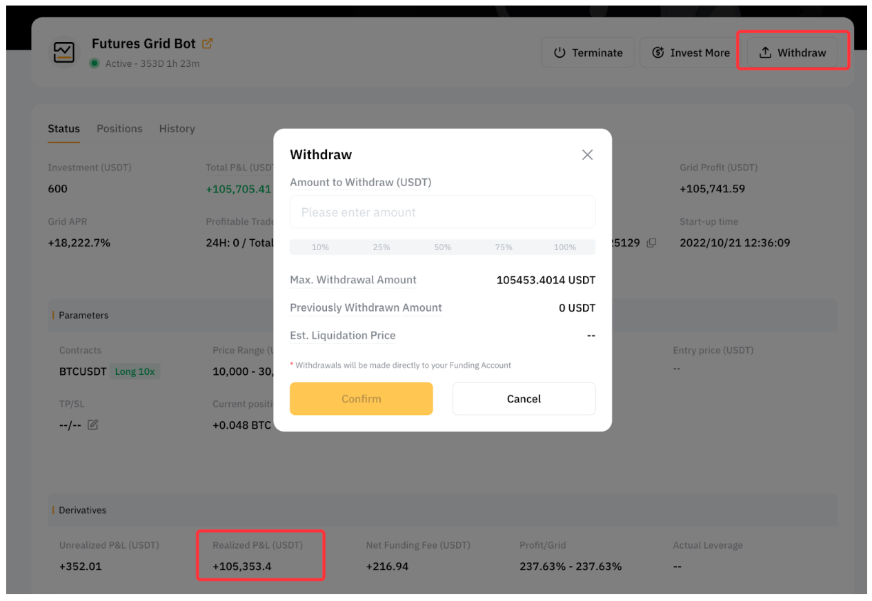 当您的网格机器人运行时,所有利润都将保留在机器人内。一旦机器人终止,您的投资金额和利润将自动转移到您的资金帐户。