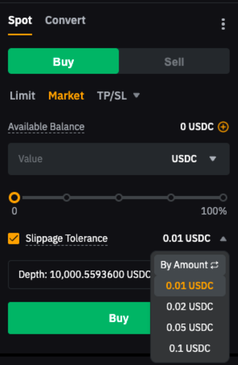 启用滑点容差后,仅当价格处于预设滑点范围内时,您的市价单才会执行,运作方式类似于限价单。您可以 按价差或百分比设置滑点容差。