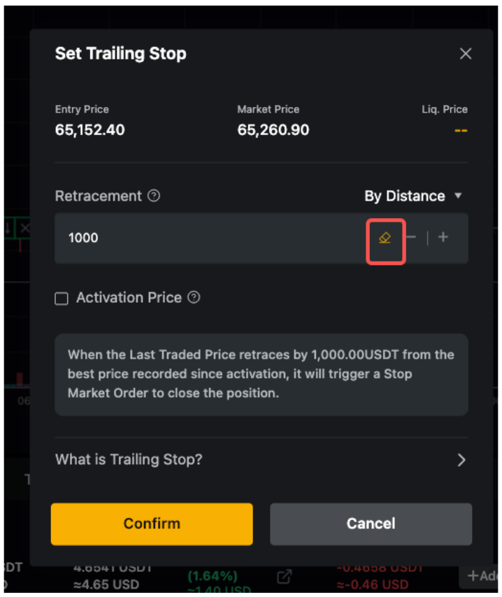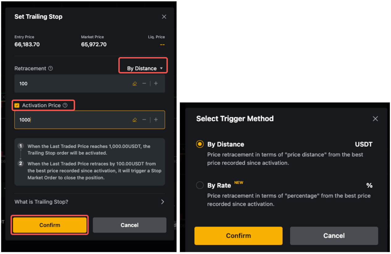 第 2 步: 选择追回触发方式(按费率或距离),并根据需要设置触发价格。然后点击确认。