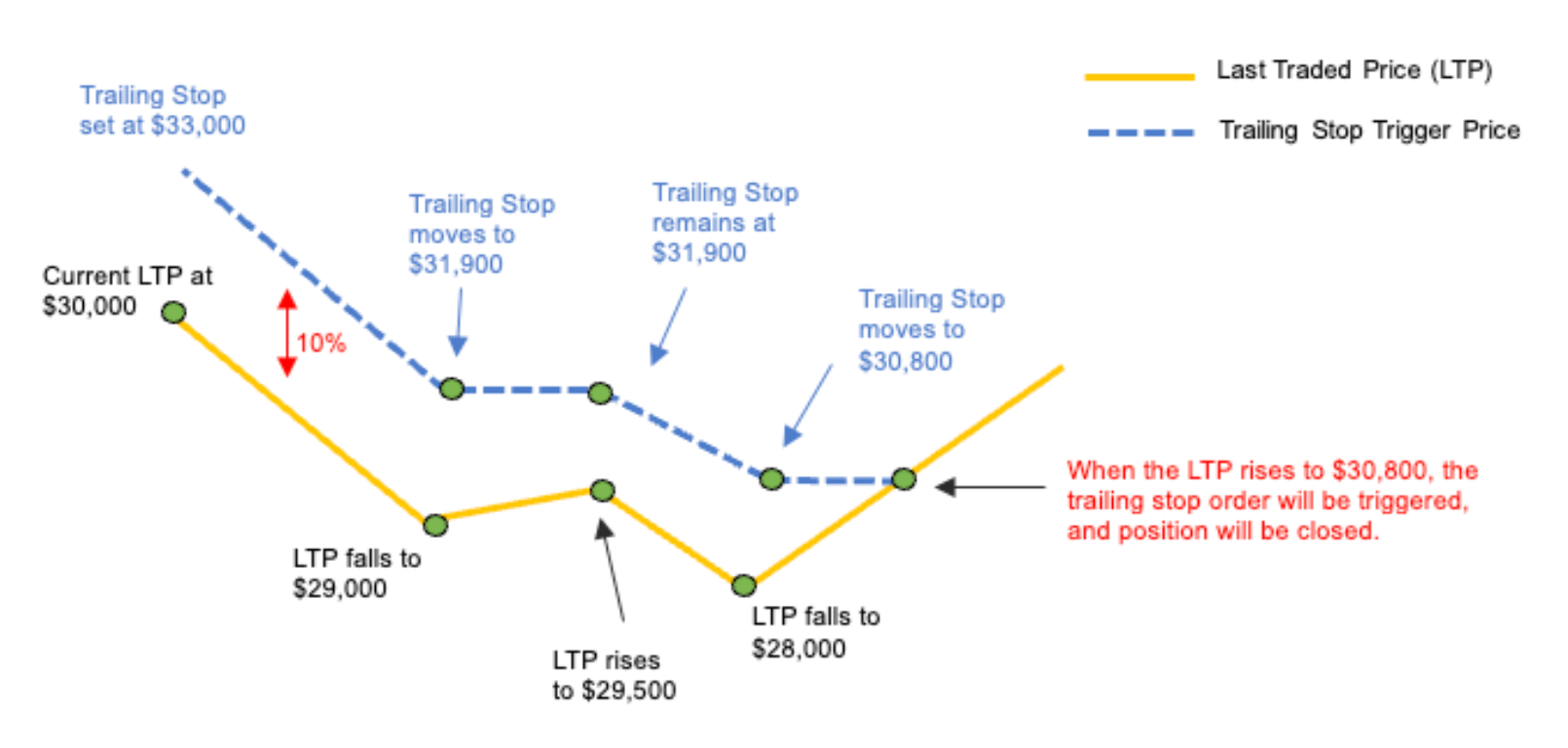 如果最新成交价从未跌至 $30,000 以下,追踪订单将以 $33,000 触发,这与正常止损类似。