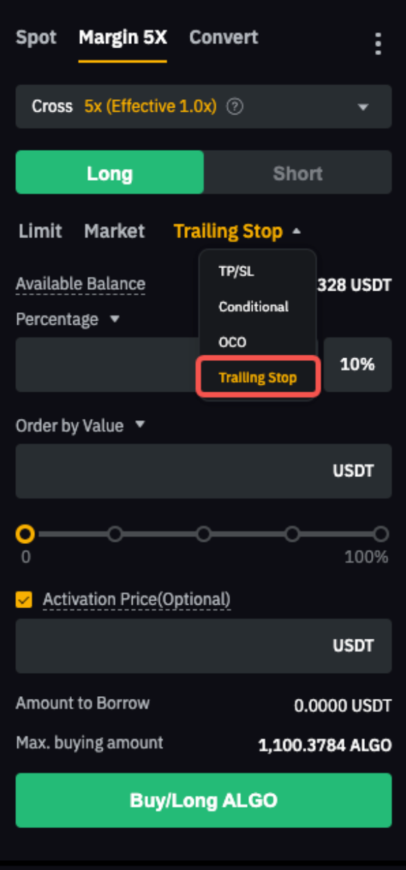 卖出订单: 最高价格 - 回撤距离或最高价格 x (1 - 回撤百分比)