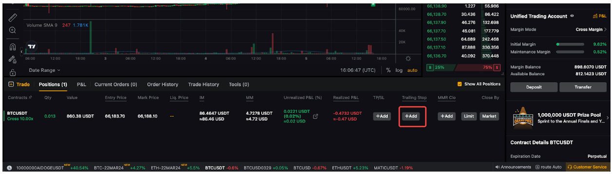 第 1 步: 在永续和合约交易页面导航到您的已开仓仓,然后点击追踪订单下的添加。