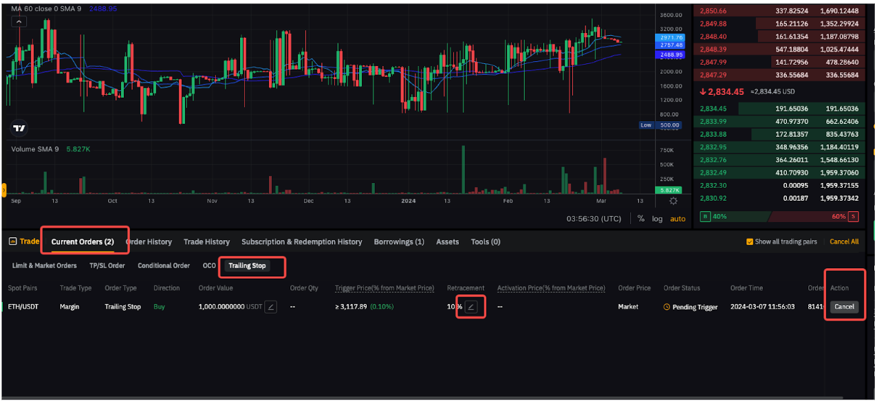如果最新成交价跌至 3,700 USDT,追踪订单将维持在 3,690 USDT。