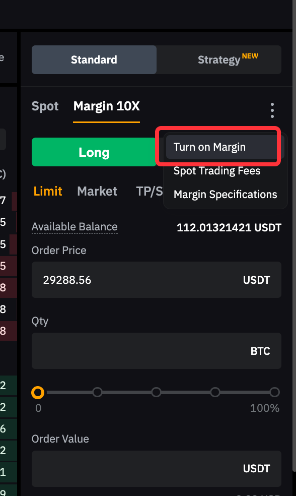 是的,可以通過現貨槓桿交易功能借入資金在現貨市場進行交易。 您可以通過切換到訂單區域中的槓桿交易選項卡並打開槓桿交易來啟動此功能。